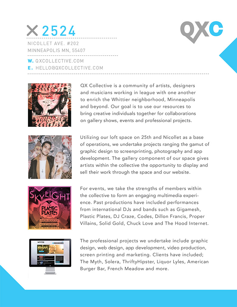 QX Collective is a community of artists, designers and musicians working in league with one another to enrich Minneapolis and beyond. The goal is to use our resources to bring creative individuals together for collaborations on gallery shows, events and professional projects.