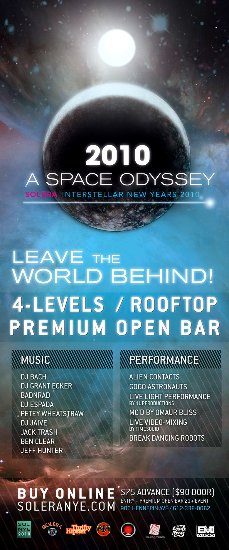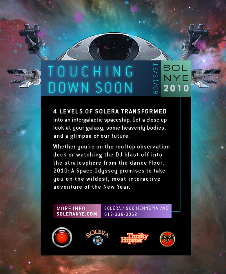 Due to the previous year's success of Solera's NYE party we were brought back for 2010 to rock out another huge sold out show. Bringing in many of the same contractors and performers, we crafted a completely new theme event, with the highlight production piece; a DJ booth created to be a spaceship that blasted 20ft in to the air at midnight.